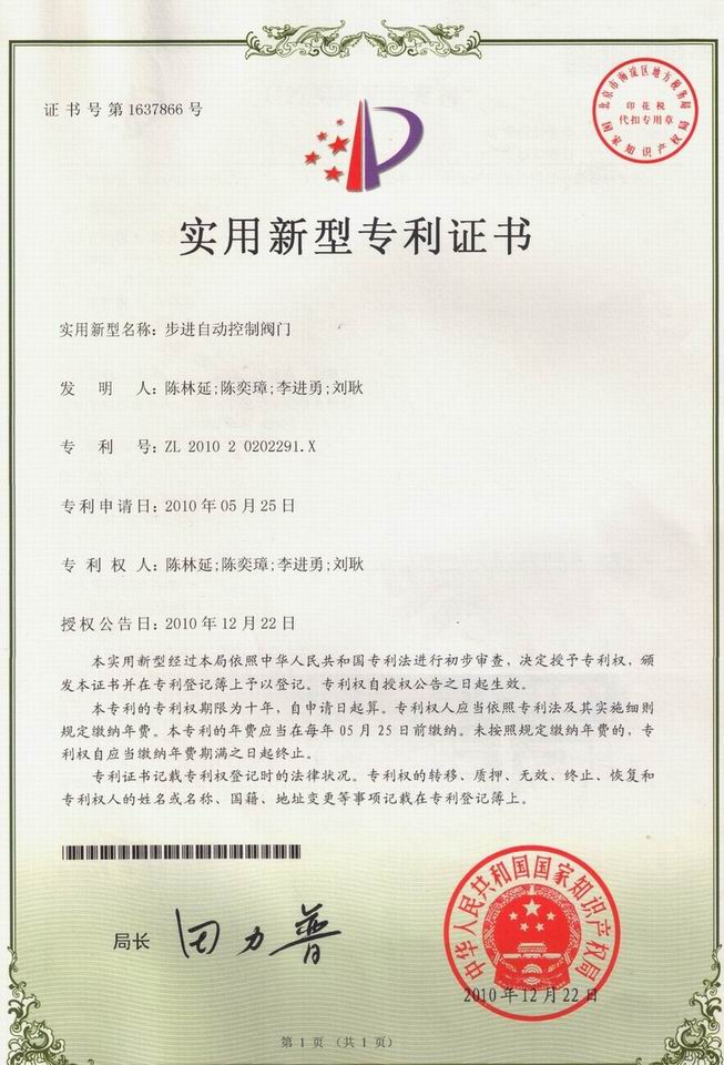 步進自動控制閥門,專利號:ZL 2010 2 0202291.X