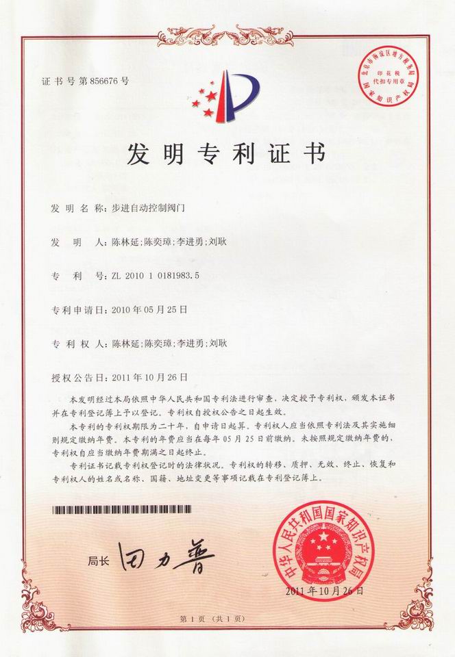 經過公司研究人員兩年多的不懈努力,刻苦鉆研“步進自動控制閥門”研發(fā)成功,并于2010年5月25日向國家知識產權局申請專利保護。國家知識產權局經過實質性審查,于2011年10月26日授予專利權并頒發(fā)發(fā)明專利證書。