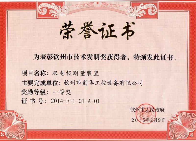 2015年12月30日下午3:00市委、市政府在市行政中心C座會議廳召開2015年欽州市科學(xué)技術(shù)獎勵大會暨促進(jìn)科技成果轉(zhuǎn)化行動推進(jìn)會,我公司產(chǎn)品《雙電極測量裝置》喜獲2014年度欽州市技術(shù)發(fā)明一等獎。