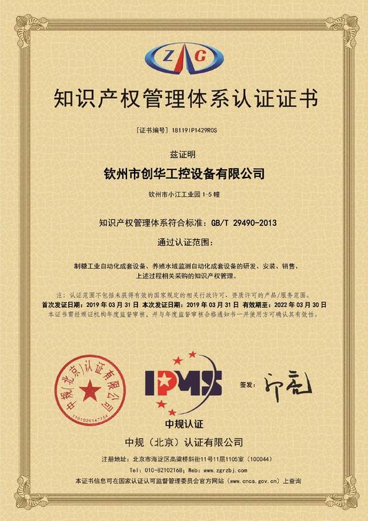 欽州市創(chuàng)華工控設(shè)備有限公司于2019年3月31日通過知識產(chǎn)權(quán)管理體系認(rèn)證,獲得了《知識產(chǎn)權(quán)管理系統(tǒng)認(rèn)證證書》。